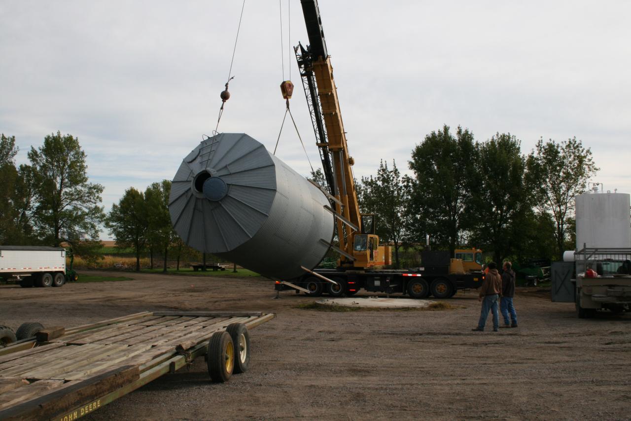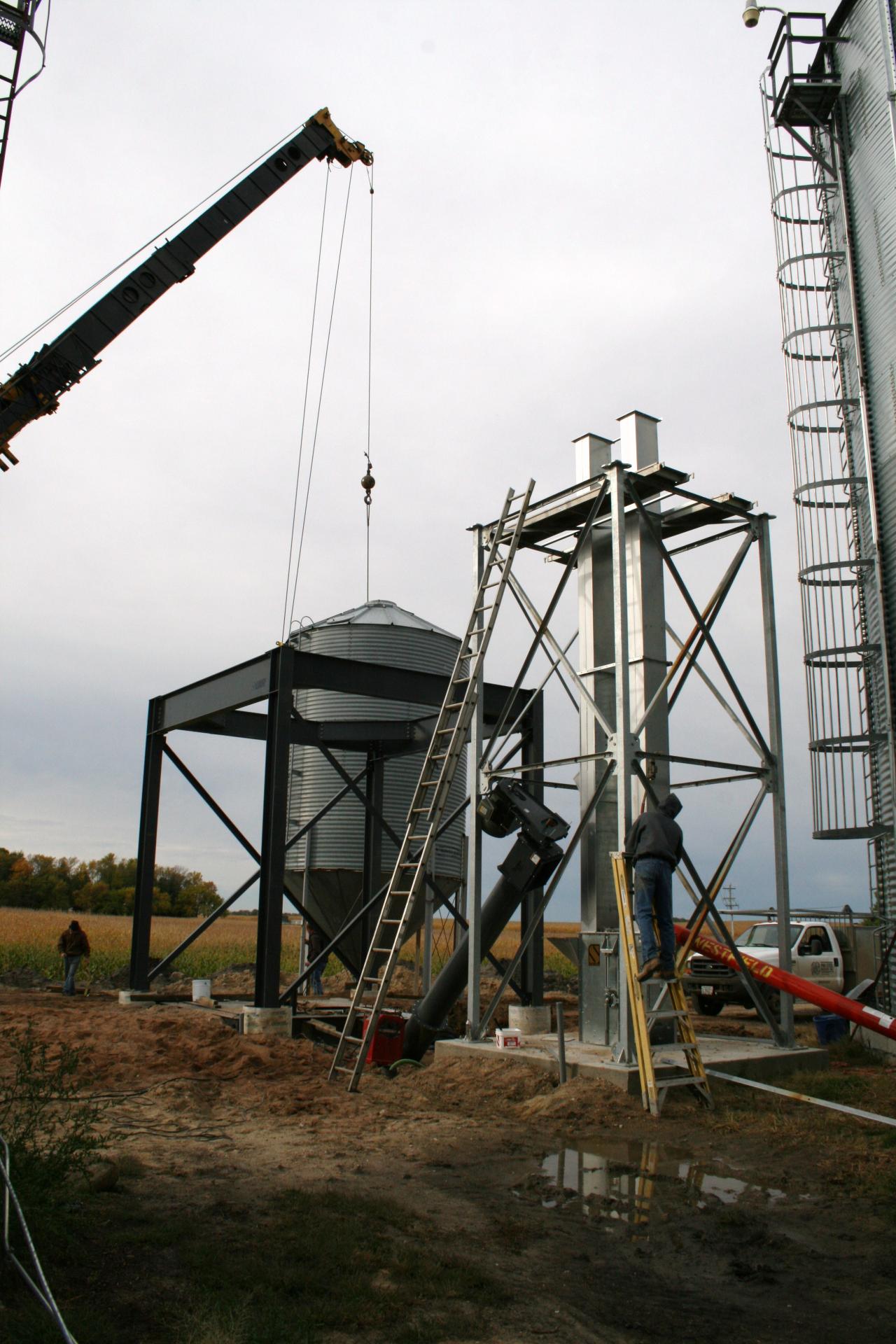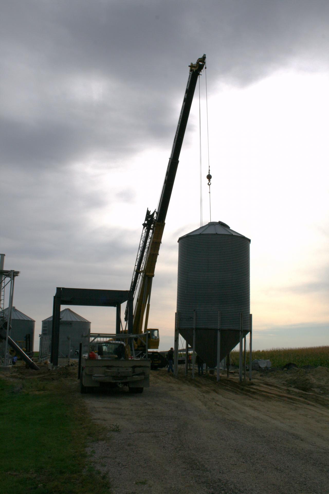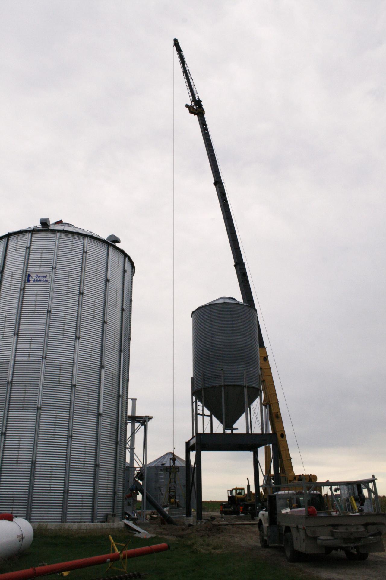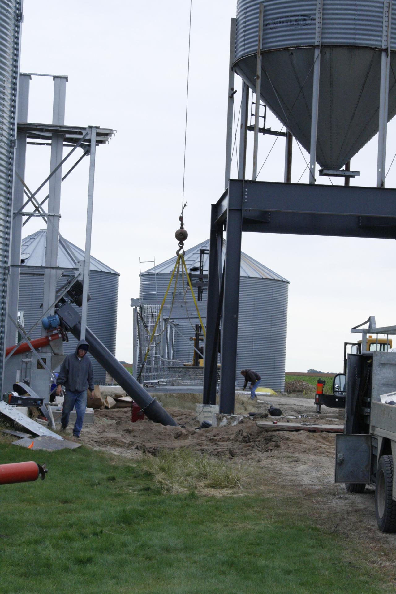 Below is a thumbnail list of photos taken during the addition of a an overhead grain bin moved from the original site and a new grain leg. These additions as well as an unloading pit to the existing site have allowed us to increase harvest productivity. Being able to unload a semi in 6 minutes instead of 15 allows us to keep the combine rolling. Being able to store your own grain also allows for flexibilty in our marketing and improves our bottom line.