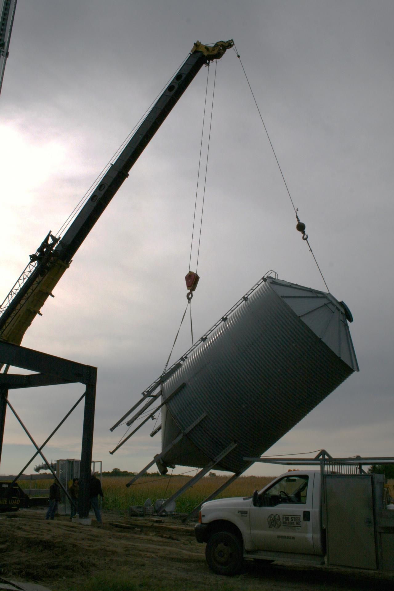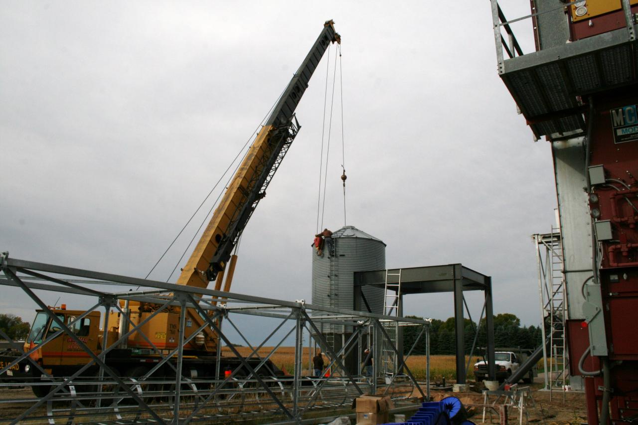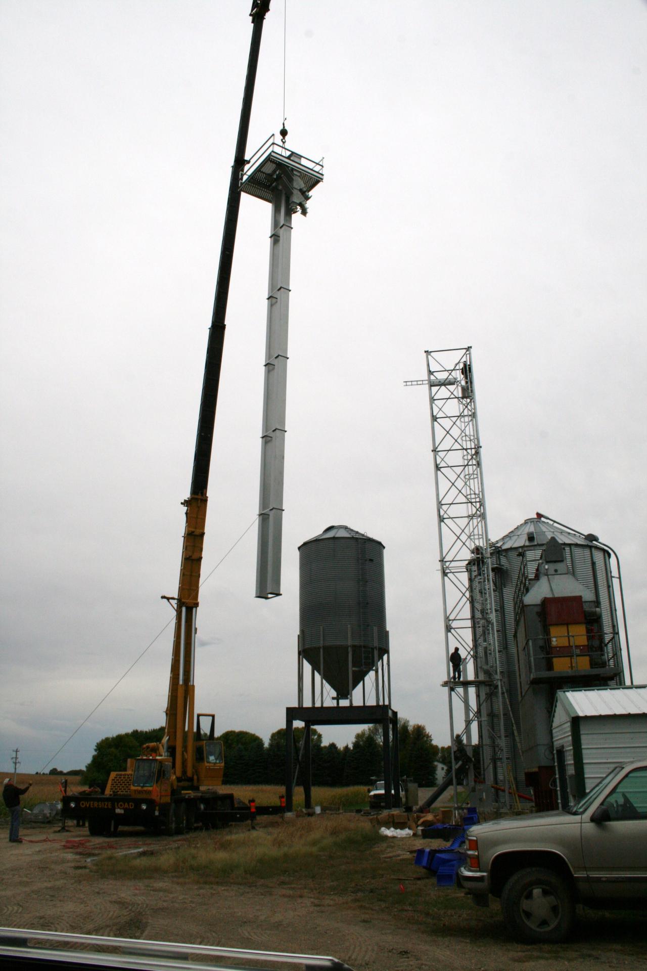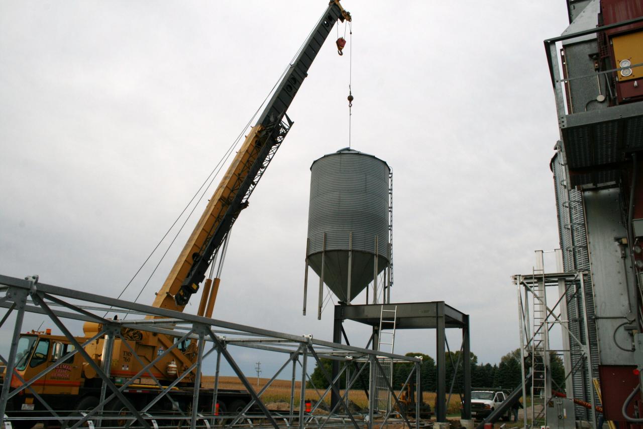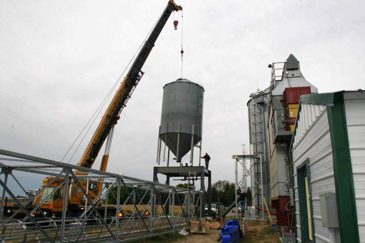 Below is a thumbnail list of photos taken during the addition of a an overhead grain bin moved from the original site and a new grain leg. These additions as well as an unloading pit to the existing site have allowed us to increase harvest productivity. Being able to unload a semi in 6 minutes instead of 15 allows us to keep the combine rolling. Being able to store your own grain also allows for flexibilty in our marketing and improves our bottom line.