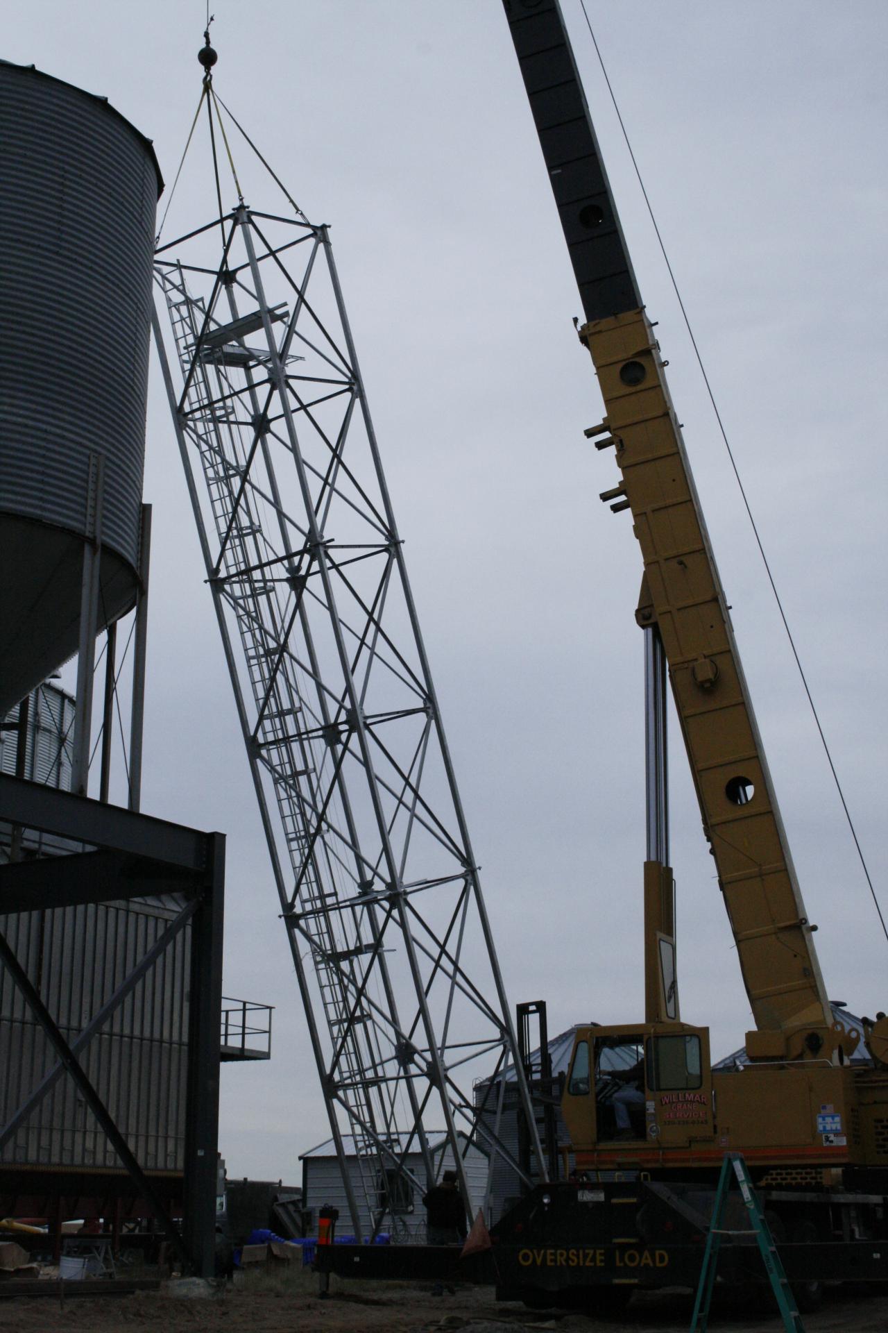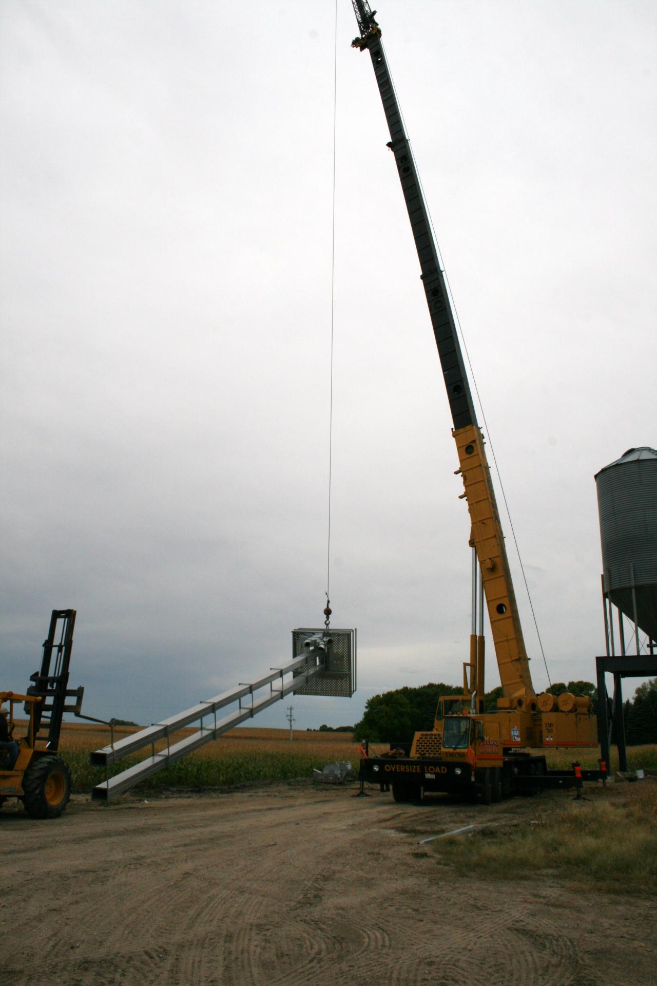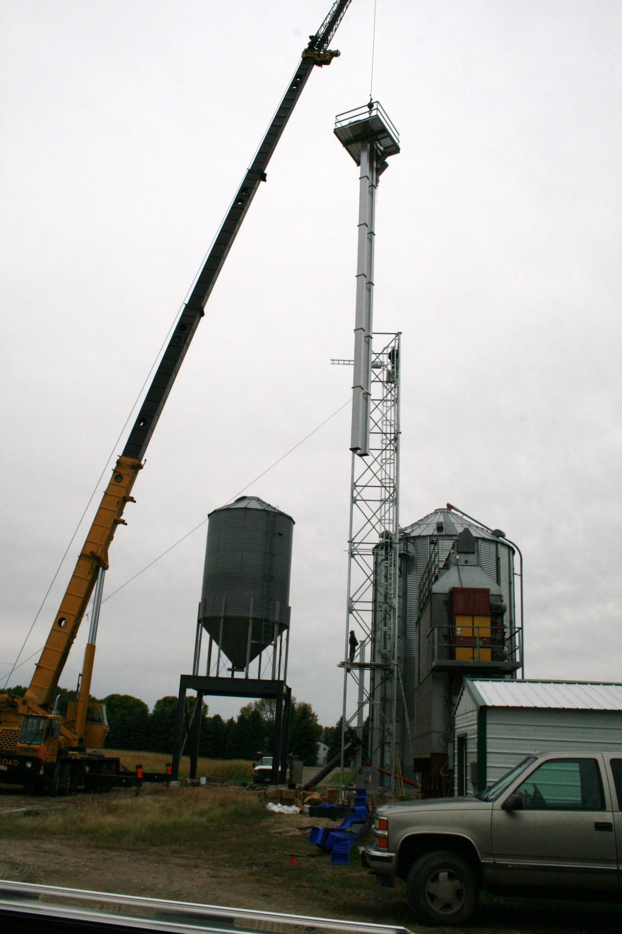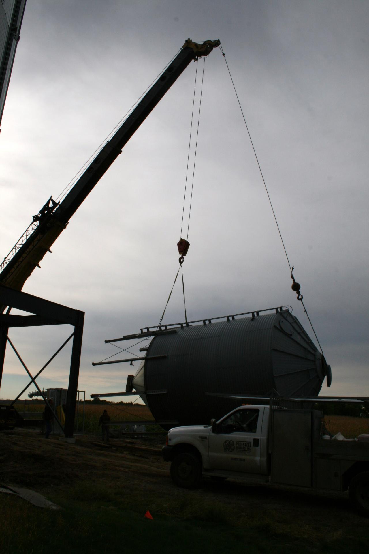 Below is a thumbnail list of photos taken during the addition of a an overhead grain bin moved from the original site and a new grain leg. These additions as well as an unloading pit to the existing site have allowed us to increase harvest productivity. Being able to unload a semi in 6 minutes instead of 15 allows us to keep the combine rolling. Being able to store your own grain also allows for flexibilty in our marketing and improves our bottom line.